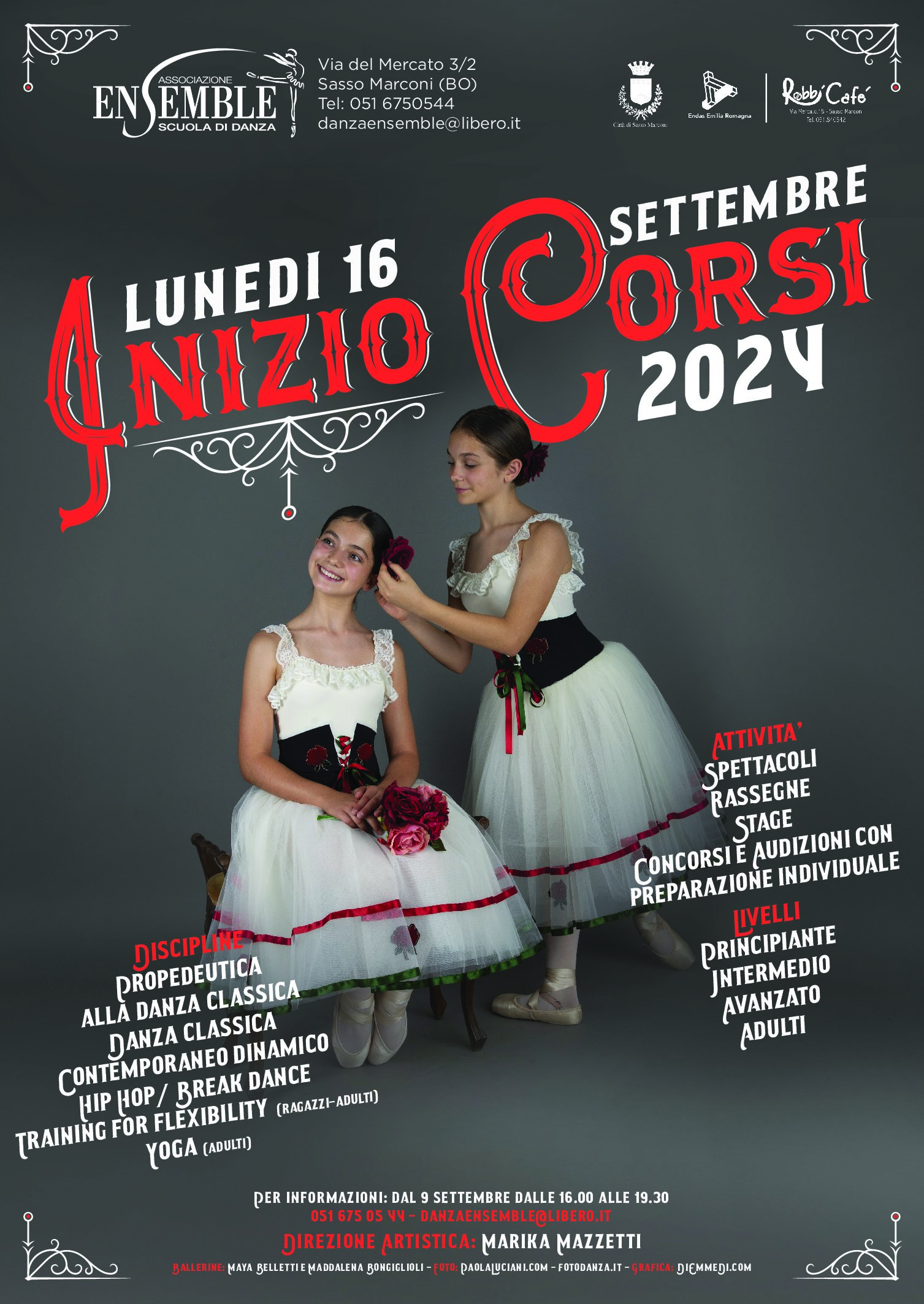 I corsi cominceranno il 16 settembre. Per informazioni potete contattare la segreteria a partire dal 11 settembre nel seguente orario dalle 16:00 alle 19:30 telefonando allo 051 675 05 44 oppure scrivendo a: danzaensemble@libero.it Ecco la locandina di questo anno...
